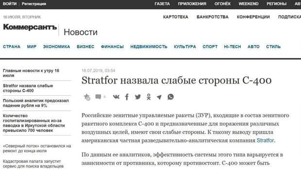 ». В том смысле, была ли реальная причина для прессы, гордо именующей себя российской, разводить эти турусы на колесах насчет «уязвимости» С-400? Вот что пишет по этому поводу «Коммерсант». Настолько доверчивый по отношению к американскому первоисточнику, что даже не посчитал нужным критически оценить его «аргументы»:«Российские зенитные управляемые ракеты (ЗУР), входящие в состав зенитного ракетного комплекса С-400 и предназначенные для поражения различных воздушных целей, имеют свои слабые стороны. К такому выводу пришла американская частная разведывательно-аналитическая компания Stratfor.